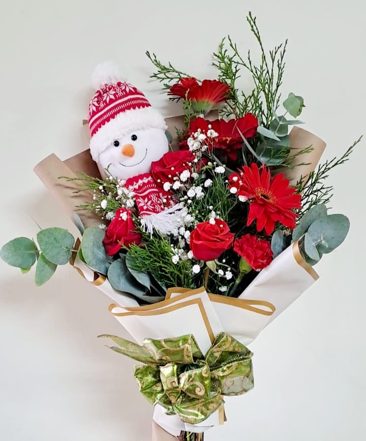 Un ramo navideño con un tiernísimo peluche, rosas rojas, gerberas, claveles y follajes de temporada.